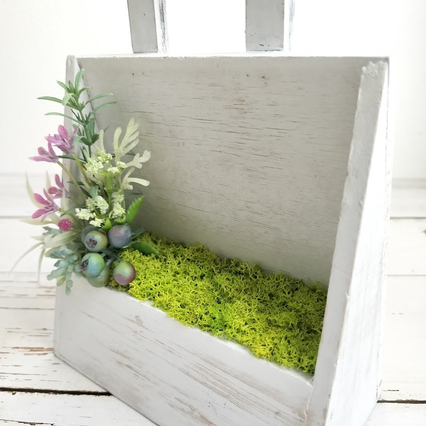 どんなインテリアにも馴染みやすいナチュラルテイストな木製の花器にモスと小花を合わせた自然なアレンジに仕上げています